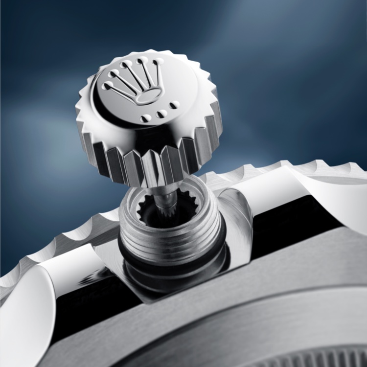 The Submariner and Submariner Date’s Oyster case is guaranteed waterproof to a depth of 300 metres (1,000 feet). The Triplock winding crown – fitted with a triple waterproofness system – screws down securely against the case, providing increased water resistance.